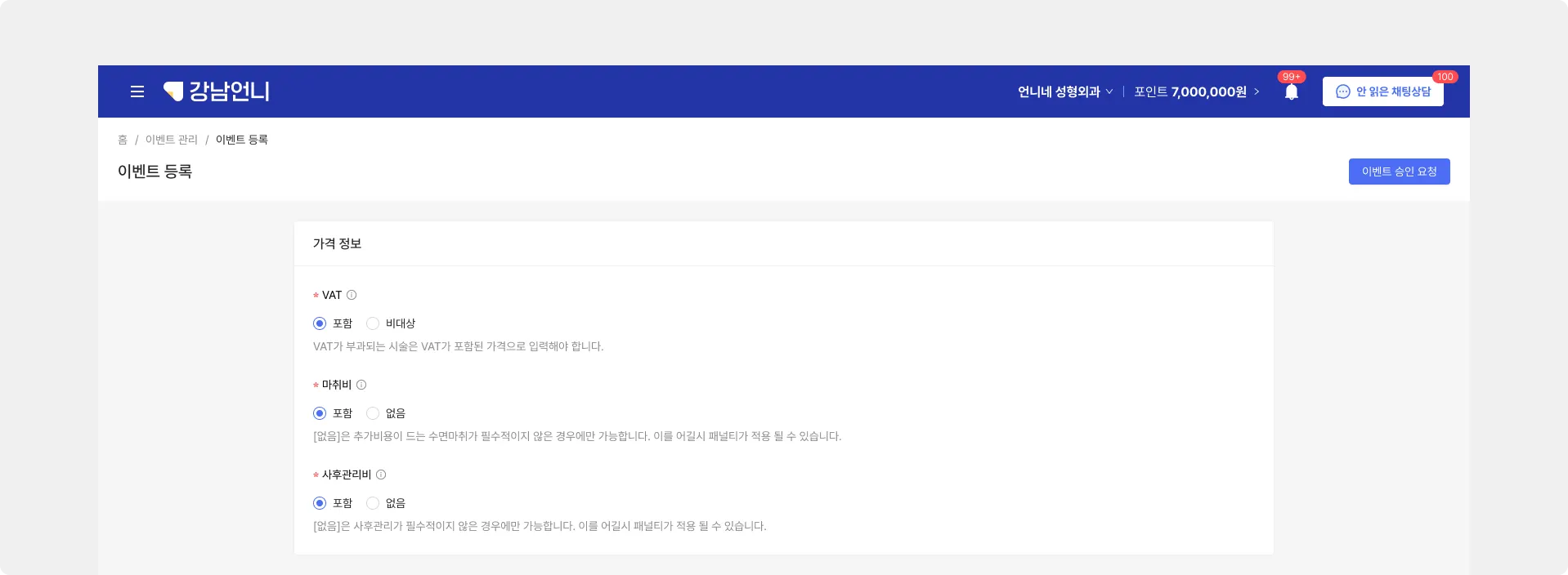 강남언니 운영정책상 미용 목적의 성형 및 시술의 부가가치세는 이벤트 가격에 필수로 포함해 주세요.